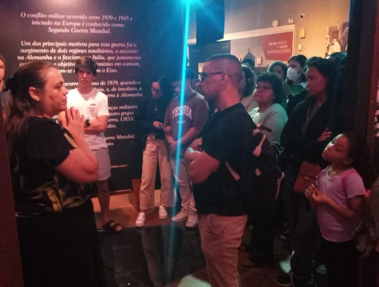Recebidos pela equipe do Memorial, os visitantes percorreram salas que retratam os horrores do nazismo – dos pogroms à Noite dos Cristais e ao avanço da Segunda Guerra Mundial. O impacto emocional foi evidente: jovens e idosos se comoveram diante das imagens, dos relatos e da dimensão humana da tragédia.