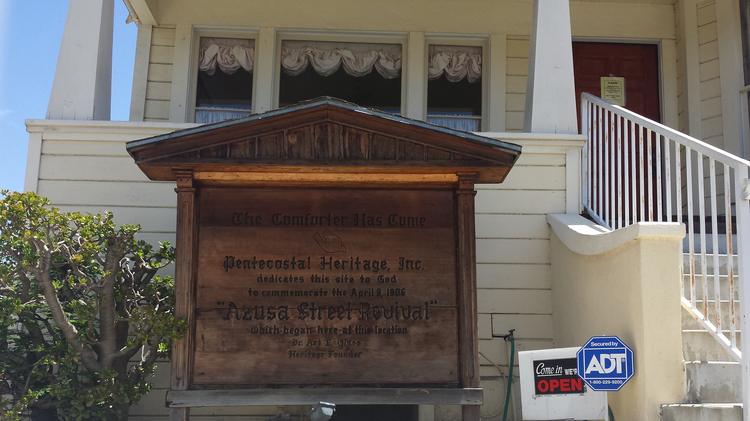 Uma placa histórica localizada em Los Angeles, Califórnia, que marca o local das reuniões do avivamento da Rua Azusa. (Foto: Wikimedia)